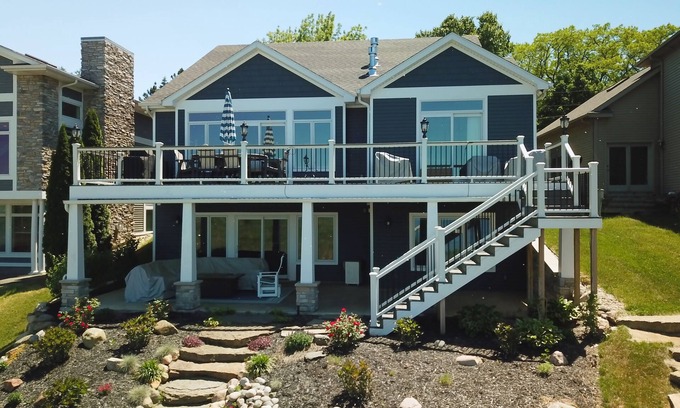 Jimmerson Blue was built for entertaining and has open-concept living rooms, kitchens, and dining areas with fantastic lake views and sunsets. Our dock can moor two plus personal or rental boats at the house. The kitchen has everything you need for grab-and-go meals and gourmet food prep, including a wet bar with a second sink and wine chiller. The butler's pantry includes a second stove, refrigerator, and laundry facilities. The upstairs great room has painted wood plank cathedral ceilings and a dining area with ample seating for 8 and 3 at the breakfast bar. The lake-side upper deck is the entire width of the home, with generous space to relax and mingle. It also includes dining for 6. With two bedrooms upstairs, the master suite is lakeside with deck access to a semi-private seating area. The downstairs consists of a living room, dining for 8, with an additional sink and refrigerator, two bedrooms, and access to the lower level covered area and fire table.