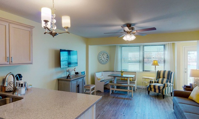 This sweet Lake Erie view condo is waiting for your visit. One bedroom with a queen bed, washer and dryer. Pull out sofa sleeps two. Fully furnished and outfitted with linens, dishes, quartz countertops, Mitsubishi air conditioning units, glassware, appliances big and small. New Mitsubishi splits for air conditioned comfort.
