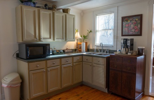 We have a kitchenette with a microwave, fridge with ice/water on the door, toaster and coffee maker. We provide several types of coffee and tea. Also we leave a snack basket with lots of goodies!