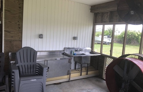 We have a huge concreted entertaining area under the camp along with a screened in eating and cooking area perfect for outside gatherings. We include a BBQ pit, boiling pot, and fish fry pot for your cooking convenience. Also included is a fish cleaning station with a sink. There is also a downstairs bathroom as well. We have a large stainless steel counter with a sink for entertaining.