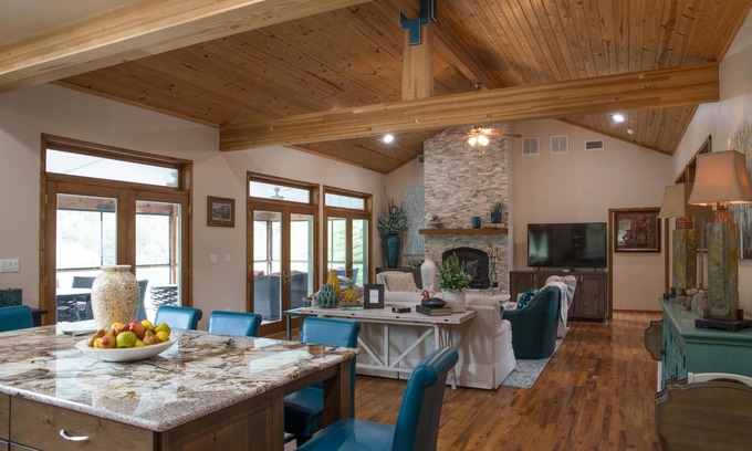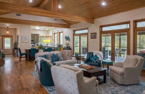 River Paradise on the South Fork of the Guadalupe River - Custom Hill Country home w/large great room / rock fireplace, lots of windows for exceptional views and wood floors throughout. Large open kitchen has plenty of room for cooking & visiting - perfect for large or small gatherings.