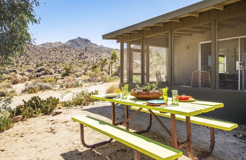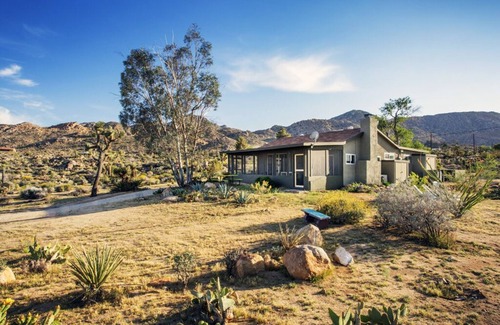 Joshua Tree Dream Weaver is a stylish remodel of 1954 homesteader cabin, perfectly situated on 5 private acres in the Joshua Tree Highlands. Conveniently located an easy 8 minute drive from Joshua Tree Village and 8 minutes to the National Park entrance. All the creature comforts are available while you're right in the heart of the high desert. Take in the properties sweeping panoramic views. The neighborhood, known as the Joshua Tree Highlands is a natural habitat for wild life. You'll see rabbits, birds and other wild life right outside the windows. Relax and star gaze in the 6 person capacity Jacuzzi, and then cool off under the outdoor shower. The fully equipped and stocked kitchen allows you to cook and bake and then enjoy your meals dining inside, or on the screened porch, or outside at the picnic table or deck bistro table. There's an outdoor grill available as well. Barn doors separate the Master bedroom with ensuite bath from the rest of the house. There's a second bathroom next to the a cozy back bedroom. Sliders lead from both bedrooms to the back deck and Jacuzzi. An open floor plan with kitchen, indoor dinging and living/conversation area lead out to a wonderful screened porch.