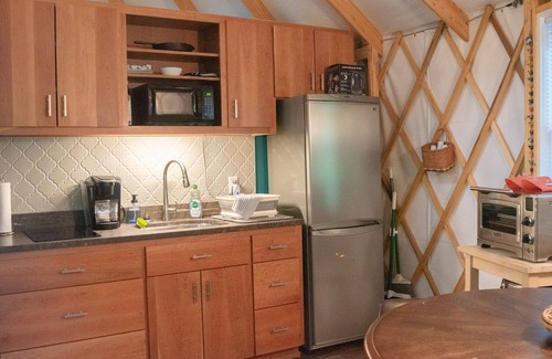 Step into the warmth and comfort of the yurt’s living space, complete with a Smart TV, DVD player, and cozy seating that transforms into a queen-size sofa bed for extra guests. The full kitchen offers everything you need to prepare meals during your stay, from a cook-top to a microwave and toaster oven. And, for the perfect morning ritual, enjoy the Keurig coffee maker with supplies for 1-2 cups of coffee—though feel free to bring additional supplies for your enjoyment.