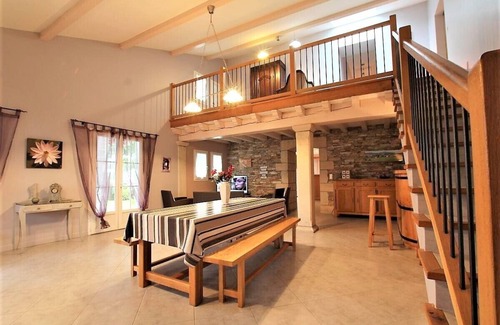 In an old family farm with traditional architecture located in the heart of the village, beautiful spacious gite furnished with taste. Ground floor: fitted kitchen (microwave, fridge-freezer, fireplace), large living room, lounge area, 1 bedroom (1 double bed) with shower room and private toilet, pantry. WC. Floor: 2 bedrooms. (2 double beds), shower room, WC, office, mezzanine with empty space in the living room. Electric heating in supplement. Possibility to rent sheets. Large partly covered terrace. Court. Private garden. Garden furniture, barbecue. Swimming pool (summer), tennis, country golf course and shops 500 m away. Presence of a year-round rental at the back of the house not overlooked.