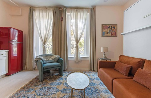 The Murphy bed system transforms the space from a chic living area into a cozy bedroom in seconds, letting you design your stay your way. The Moroccan-inspired bath, with its walk-in shower, evokes the magic of far-off destinations, while the eat-in kitchen keeps home comforts close at hand.