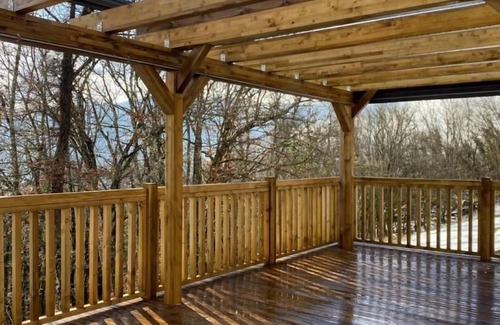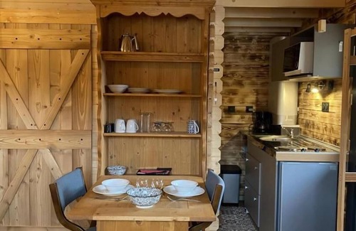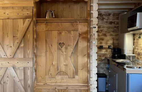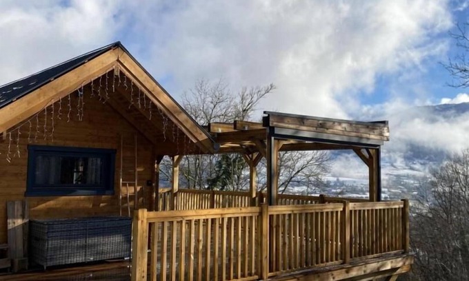 Unusual wooden frame cabin with a 50m² terrace and a pergola. Studio with kitchenette and shepherd's table, a 2-person sofa bed 140 x 190 cm, a bathroom (shower) with WC. Cleaning is the responsibility of the tenants. Sheets are included but disposable. The beds are made and towels are provided. 2 km from Arith, at the end of a dirt road suitable for 1 km, on the vast property including the main house of the owners offering guest rooms, are located these 4 wooden chalets 100 meters apart. Built with ecological materials, favoring renewable energies, this wooden chalet stands out for its originality with its huge 50m² terrace and its unusual spirit with its "small wooden cabin" architecture.