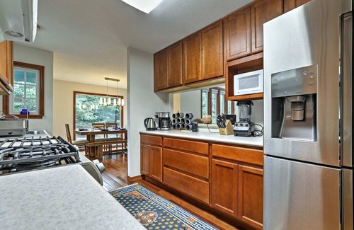 Spanning the second and third floors of the main house, this 2,000 sq. ft. unit combines rustic charm with modern comfort. Hardwood floors, vaulted ceilings, and large windows create a bright and inviting space with mountain and forest views. Cozy up by the pellet stove in the living room or enjoy a glass of wine while taking in the serene scenery. The fully equipped kitchen, complete with stainless steel appliances, offers everything you need to prepare meals, which can be enjoyed at the dining table for six.