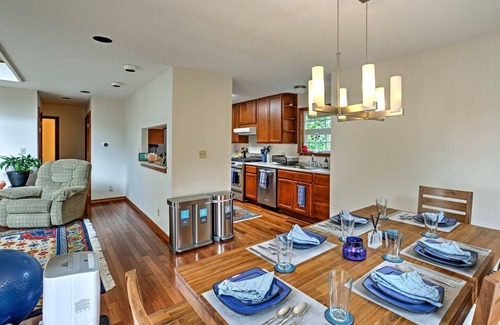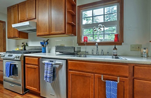 Perched above the detached garage, this cozy apartment is ideal for couples or small groups. After a day of exploring Mt. Roberts Trail or fishing for salmon, unwind in the welcoming living space. Relax on the comfortable couch, stay connected with complimentary Wi-Fi, or whip up a meal in the fully equipped kitchen with emerald green tile countertops and stainless steel appliances. Enjoy your meals at the bar-style dining area that seats four.