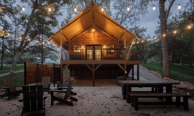 Escape the hustle and bustle of city life and enjoy a safari-inspired, socially distanced glamping experience in Ashland, Nebraska. The Junglaow Safari Cabin is a 2 bedroom, 1 bathroom luxury safari-style cabin that offers 410 sq ft of cozy glamping with all the comforts of home.