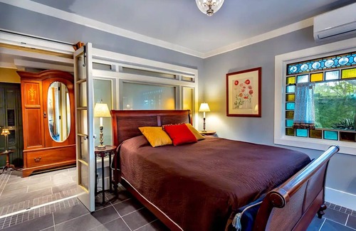 In the GARDEN PARLOR, which is located between the Den and the BR, one finds a beautiful Arts and Crafts lead glass French door set, which open onto the East Camellia Gardens. In the Parlor, there is a small desk, chair, an antique 1880's Wicker settee and a wardrobe. Antiques, original paintings, unique art works and 19th C stained glass windows adorn the JUNGALOW throughout.