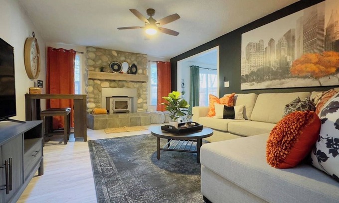 Welcome to our spacious 4BR home in Lake Forest! Exclusive access to Long Lake park and dock for outdoor fun. Minutes from the freeway, close to attractions like Cabela's, Costco, Walmart, and dining. Fully equipped kitchen with coffee bar. Two large decks, one private off the primary suite. Attached garage, in-home laundry. Luxurious king suite, queen, jungle-themed room with 2 double beds and 2 twins, plus a home office. Ideal for families or groups seeking comfort and convenience!