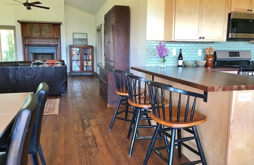 - Dining: Large square table seating eight, plus breakfast bar with seating for three.