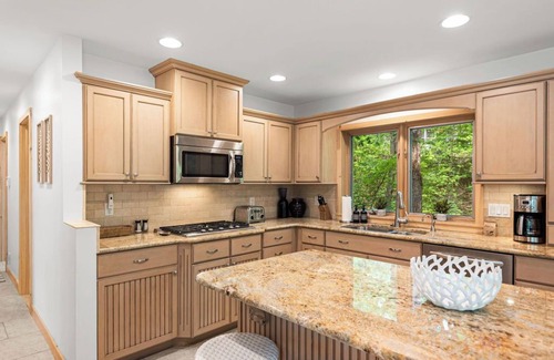 The moment you step through the front door, you’re greeted by a bright, open-concept interior that’s perfect for gathering with loved ones. The spacious living room features soaring ceilings and expansive windows, flooding the space with natural light and offering picturesque views of the surrounding woods. Sink into the plush sofas by the fireplace, where cozy evenings await with a movie on the large flat-screen TV. Adjacent to the living area, the dining space and fully equipped kitchen make entertaining effortless, with seating for everyone and everything you need to whip up your favorite meals.