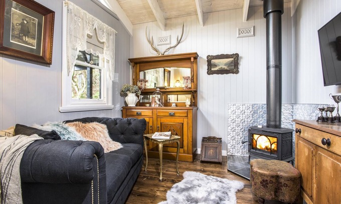 You will be very comfortable in the antique iron queen bed, or cosied up by the fire in the lounge room watching Foxtel on the large TV. The kitchen is delightfully put together for you, so lots of interesting antique kitchen ware - even a Kookaburra Stove which is just for 'Show N Tell' - it is decorative only. But we have included a fridge, a microwave and an electric frypan as well as the absolutely essential Nespresso coffee machine, kettle and toaster.
