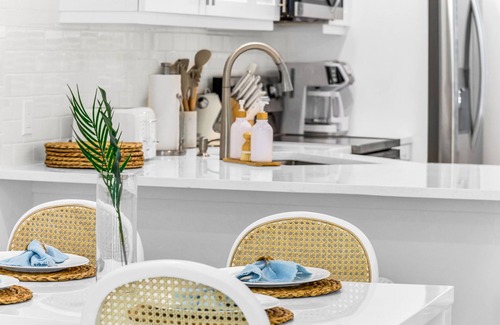 The modern white table seats 4 for intimate dining, There are 4 natural cane dining chairs to add to that coastal flair and an impressively large round rattan "sun" mirror that centers over the dining table. There are 5 sky-blue rattan bar stools at the impressively large quartz kitchen counter. The kitchen also has a kitchen nook with 2 upholstered rattan and cane benches, a modern contemporary white round table, and a decorative Fiddle tree, which sits alongside a surf-scene art piece.