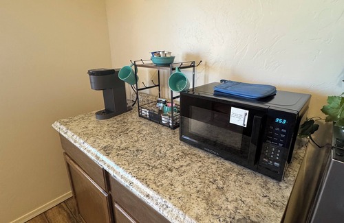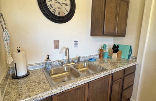 Completely private from the main house, this attached 2 bedroom/1 bath apartment sleeps four people with one queen bed and two twin XLs. The kitchenette is equipped with a sink, refrigerator, microwave and Keurig coffee maker. Outdoor cooking is available with a Blackstone flat top grill and full-size Camp Chef two burner propane stove. Pots, pans and cooking utensils are provided. You'll have private parking with a lighted pathway for after-hours arrivals. Enjoy 4KHD TV's in both bedrooms with complimentary Netflix, Hulu and other streaming apps available. Both bedrooms have separate minisplit AC/heat pumps for your comfort.