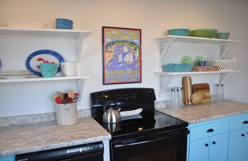 The kitchen has everything you need including a dishwasher, refrigerator, range, microwave, and double bay sink. The refrigerator includes an ice maker. Appliances include a hand mixer, toaster, and coffee maker. Additional comforts include a coffee station stocked with local coffee beans, a coffee grinder, and a selection of tea and hot chocolate. We also provide a selection of snacks to tide you over until your next meal. Visit our Thursday farmer’s market to stock your fridge with local produce, cheeses, meats, breads, and pastries. The cupboards are stocked with pots and pans and baking dishes as well as serving dishes and utensils.