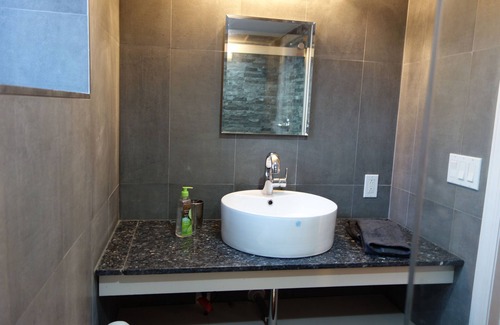 This renovated basement apartment has the feel of an industrial loft. Steel ceilings, exposed beams, brick wall coupled with granite counters & stone-walled shower make this a great place to stay. There is a toaster oven, microwave & Keurig (with an assorted coffees) , but there no oven/stove or cooking utensils available to you.