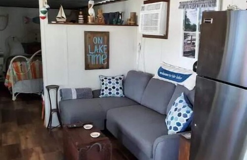 Private waterfront cabin and pier. The cabin has a lake atmosphere decoration. It has separate bedroom and bathroom. Living, kitchen, and dining is open concept.