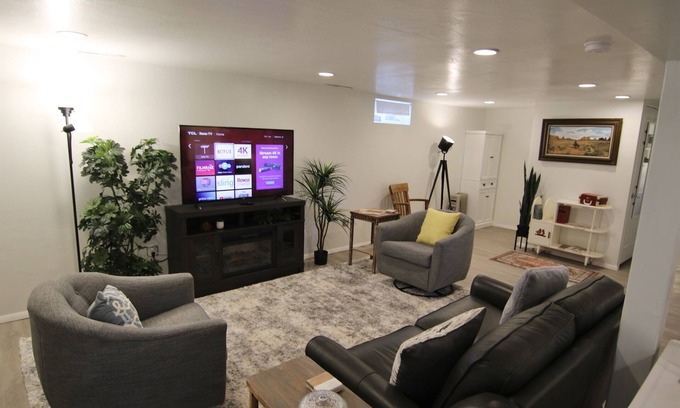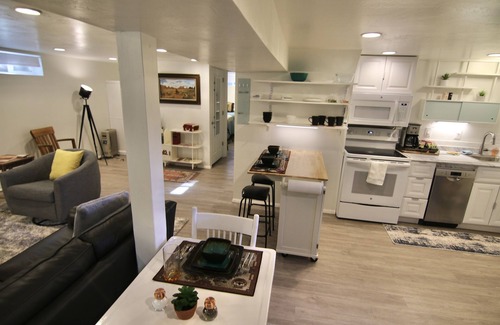 Newly remodeled mid-century modern well-lit basement apartment. Sleeps up to four people. Free parking on the street. High-speed Internet and WiFi with 55 inches smart TV. Radiant electric fireplace with blower works by remote or buttons on the fireplace. The desk work area has activity books and a charging station. Room one has a California King bed with a vanity area and lighted mirror as well as lamps that have USB ports. Room two has a queen bed and lamps that have USB ports as well as a clock with ports and plugs. A small pull-down desk area can be used if a quiet work area is needed. The bathroom has a shower with amenities located in the mirror cabinet. Towels are in the bathroom and extra towels are in the bedroom closets. First aid items are in the hallway medicine cabinet. The living room storage closet has a broom and mop as well as cleaning supplies. New furnishings and appliances are part of the new remodel, with a full kitchen and dishwasher. To avoid scratches on the glass cooktop, Please pick up pans when cooking on the stove. There is a stackable washer and dryer. Laundry supplies are in the cupboard on the wall. The owner lives on the main level and noise levels are kept very quiet. The enclosed-insulated utility closet has a tankless water heater and furnace. Slight noises occur as they power up for hot water, heating, and cooling needs. (You may not get a cell signal when out hiking, so download maps and information before your adventures for the day.)