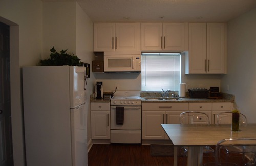 This true one bedroom, one bathroom offers a Sleek and Contemporary Design with full amenities in the Lake Morton Historic District. Centrally located. Some of the many Amenities include: Apple TV, Internet, Fully stocked Kitchen (fridge, stove and oven, pots, pans, toaster, microwave, Keurig, 12 cup Mr. Coffee brand coffee pot), Dining room table with seating and settings for 4. Living room has a Futon Couch that converts to a bed, and a very comfy recliner along with two additional chairs for guests. Washer, Dryer with supplies and more.
