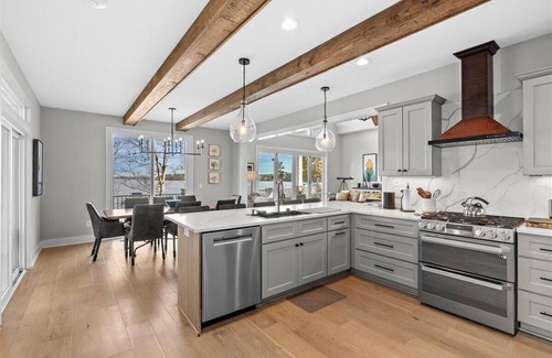Prepare to be amazed by the cook's kitchen, where culinary delights await. Equipped with a top-of-the-line 5-burner gas stove, double oven, microwave drawer, and all-clad pots and pans, this kitchen is a chef's dream come true. A focal point of this culinary haven is the expansive and versatile large kitchen island, offering ample space for food preparation, serving, and casual dining. Gather around the spacious dining area, adjacent to the kitchen, and savor delicious meals together, surrounded by panoramic views of the lake. Whether you're whipping up a gourmet feast or enjoying a leisurely breakfast, this kitchen provides the perfect setting for culinary adventures and memorable moments with loved ones.