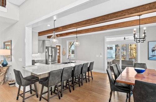 Experience the height of luxury at this remarkable waterfront estate situated on the serene shores of Lake Gaston. With its prime location on the main lake offering sweeping views, this newly constructed retreat provides over 4,000 square feet of comfort and style, promising a haven for relaxation and entertainment. With six thoughtfully appointed bedrooms, each bearing its own special name, including plush king and queen beds, as well as additional sleeping arrangements like a queen trundle and a queen pull-out sofa, this home comfortably hosts up to 16 guests. Every room offers a peaceful sanctuary for a rejuvenating night's sleep after a day of lakeside adventures. Freshen up in one of the four private full bathrooms or two shared full bathrooms, equipped with modern amenities for your convenience. Each bathroom is designed for practicality, ensuring a comfortable experience for all guests. Additionally, the primary suite boasts a luxurious bidet, adding an extra layer of comfort to your stay.