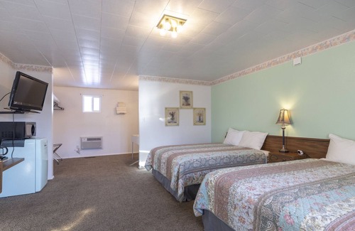 This room features two Queen beds with a private bath including a shower/tub combo to soak in after a long day of exploring. Our motel is one level only, so this room is easily accessible from the parking lot. This room is equipped with A/C, microwave, mini fridge, coffee maker and a large TV with Cable for your comfort and enjoyment.