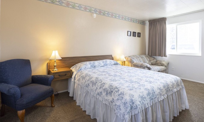 This room features two Queen beds with a private bath including a shower/tub combo to soak in after a long day of exploring. Our motel is one level only, so this room is easily accessible from the parking lot. This room is equipped with A/C, microwave, mini fridge, coffee maker and a large TV with Cable for your comfort and enjoyment.