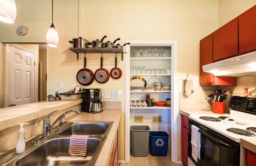 The vaulted beamed knotty pine wood ceilings make the over 1000 square feet seem even bigger. The kitchen is fully equipped to handle cooking big meals, and the Whole Foods world headquarters and Trader Joe's is approx 2 miles away. Several smaller convenience stores are blocks away.