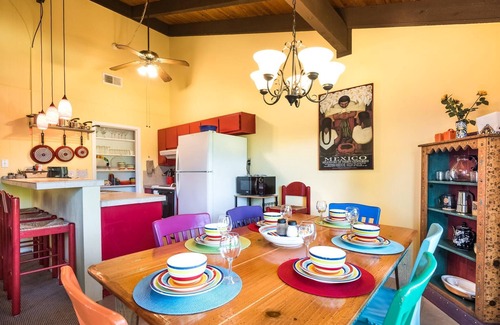 The two bedroom/one bathroom “Kaleido House” is the largest unit in the Zilker Vacations family. It features by far the most original art and colorful decor to go along with the spacious tall ceilings.