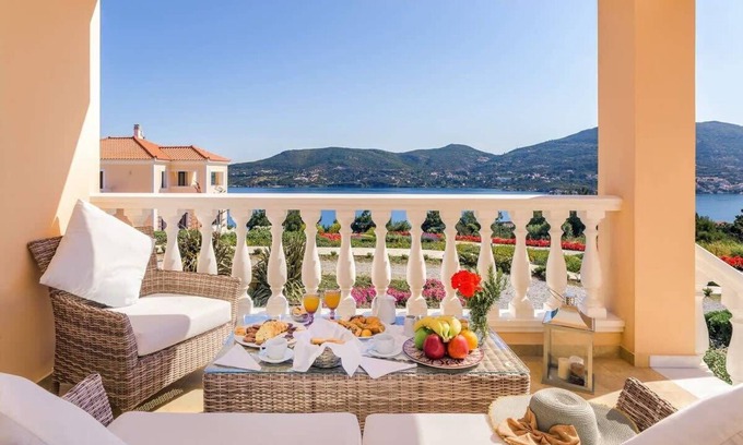 Guests enjoy private access to the Kalypso Suite, including all interior rooms, balconies, and terraces. Access to shared swimming pool and gardens also included.