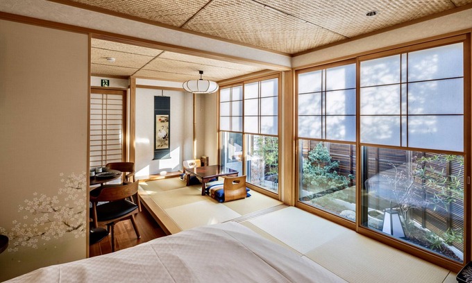 Nestled in the quiet, peaceful north of Kyoto, this exquisite two-story home blends modern comfort with traditional elegance. A bright tatami room offers tranquility, complemented by stunning fusuma doors depicting a large sakura tree and flying cranes. The beautiful Japanese garden provides a serene retreat. The house features three spacious bedrooms, including a queen-size bed on the ground floor, ideal for guests who prefer to avoid stairs. The other rooms offer the comfort of Japanese futon. Stylish bathrooms as well as separate restrooms are located on each floor. The entire second floor is bathed in natural light, creating an inviting atmosphere, perfect for families with children.Conveniently located just a 2-minute walk from the subway, this home offers the perfect blend of tradition, comfort, and accessibility.Quick Layout Overview:1st Floor: Kitchen, Queen-size Bedroom, Japanese Living Room, Bathroom, Restroom, Laundry Area2nd Floor: Two Bedrooms, Bathroom, RestroomThe house is fully furnished and includes free Wi-Fi, TV, induction stove, microwave, refrigerator, modern coffee machine, washer, two bathtubs, hairdryer, air conditioning, and low cushions to enjoy the tatami room and garden view.