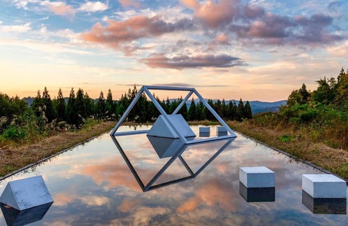 There is an art CUBE Floating in a water mirror outside the dining room