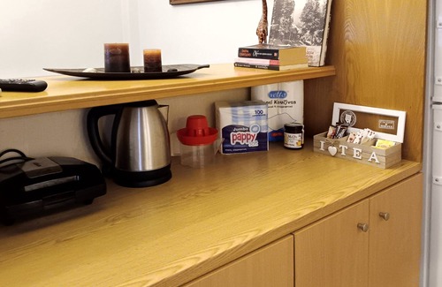 In the bathroom, you will find a washing machine, bucket, mop, broom, and dustpan. The kitchen is fully equipped with a large refrigerator, an electric stove, a toaster, a filter coffee maker, cutlery, plates, glasses, and other essential utensils.