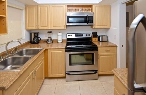 Full size kitchens fully supplied with what you need to cook and entertain including toaster, blender, and coffee maker.