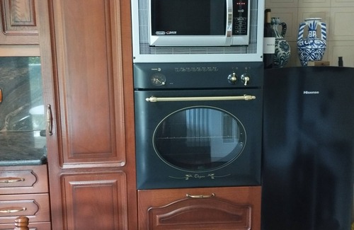 Karaltzos offers a floor with 2 large rooms, one with a double bed, a complete bathroom with a bathtub, a balcony and a dressing room; and the other with 3 individual beds. There is also a toilet and a full kitchen for the exclusive use of guests. It is a two-family house with a nice garden with a swing, a trampoline and a small chicken coop. Ideal to rest with the family. A quiet place 4 minutes walk from the metro