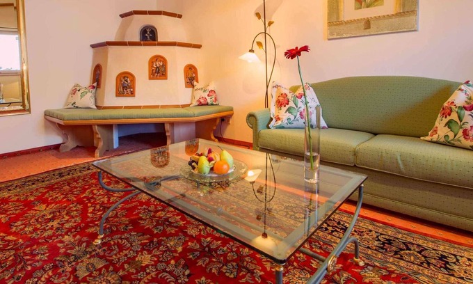 The approximately 45 m² suite is equipped with a separate bathroom and toilet and a spacious seating area with a romantic tiled stove and sleeping area. With amenities such as hair dryer, bathrobe and plasma HD TV. The balcony has a magnificent view over Lech, here you can enjoy the best view of our house.