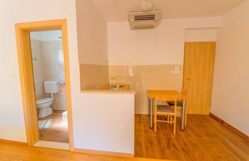 Studio provides one double bed (two single beds pushed together) and for third guest there is a sofa bed, private bathroom with shower and private furnished terrace. It's situated just 100 meters from the sea and stone private beach where you can refresh yourself in hot summer days or relax in shade of trees on lovely bench.