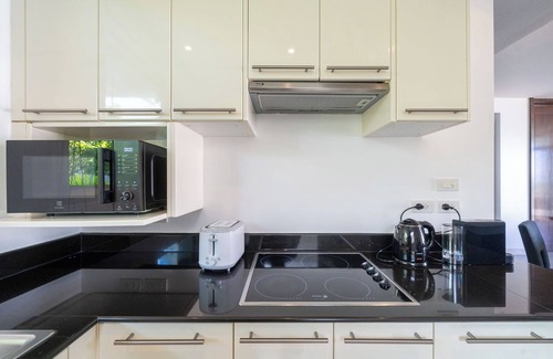 Below, the infinity pool invites you to take a refreshing dip or simply relax by the water’s edge, soaking up the tropical ambiance. Please note that this property is not suitable for wheelchair users or those with limited mobility, as there is no lift access.
