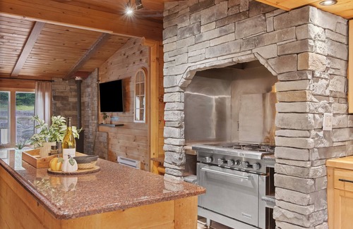 We provide everything you need for a comfortable stay. This 4,630 sq ft. lodge sleeps up to 14 people comfortably. The entire interior of the home looks like a log cabin with an open concept surrounded by 6 skylights and large windows letting in all the natural lighting w/ mountain views. The grand living room has a beautiful stoned wood burning fireplace with 2 sofas, 2 accent chairs and smart TV. There is a dining table and a breakfast nook that have seating for up to 14 people. The kitchen is fully stocked with everything you need for a short or long term stay. All appliances are brand new (NXR industrial stove, refrigerator, microwave, dishwasher, pots/pans, cooking utensils, utensils, cups, plates, trays, wine opener, can opener, etc.) As you walk through the kitchen, you will find yourself in the family room with a 2nd living area. It has another small sectional, electric fireplace for extra warmth and smart TV. This section of the home is connected to the 3 bedrooms and 2 full bathrooms. There are 2 entrance/ exits on the main floor.