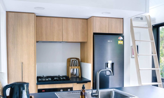 Includes a fridge, freezer, stove, sink, dishwasher, toaster, water kettle, coffee plunger, wine glasses, cutlery and cooking essentials. There are stools at the bar to sit and eat or enjoy the nearby sofa or outdoor seating area!