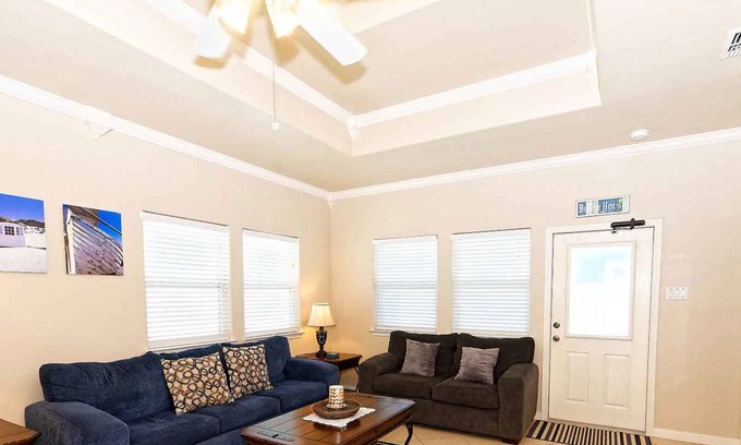 After a fun day at the beach or fishing, kick back and relax in this affordable pet friendly vacation home with shared pool. It even has a kid's splash pool! The open floor plan makes the space even larger with high ceilings and comfy furnishings. Bring a bike or rent a golf cart and you'll be at the beach or in town in minutes. There is no direct beach assess but there is a paved sidewalk all the way to the beach.
