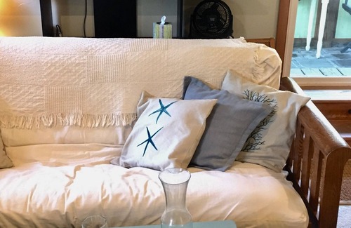 Tall guy alert: Tall guy alert! There are some low door ways! Living room with full size futon sofa bed, wireless internet, flat screen TV w/DVD player; no cable service, but iPad and other device users can stream to this tv via Chromecast. The bedroom features antique mahogany sleigh bed with two large antique dressers. There is a room air conditioner in the bedroom, but chances are our ocean breezes will keep you cool! The ceiling in the bedroom is on the low side. In the dining area, seat 4 at the country table or find a workspace at the mahogany desk (for long evenings working on your Great American Novel…or postcards from your vacation...)