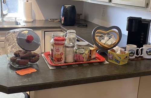 At the back of the yard, stairs lead down to a beautiful gazebo. The gazebo features a screened-in room and a panoramic deck where guests can sit in Adirondack chairs and take in breathtaking views. Down the stairs from the gazebo is a private dock, perfect for fishing or lounging on inner tubes. Guests can also use the dock to park their boats or jet skis, and the stairs leading down to the dock have been recently reinforced with support railings for added safety.