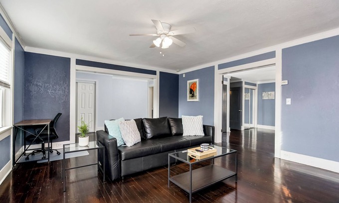Ground floor unit of a triplex that has been converted from a single-family home. Centrally-located in South Hyde Park, experience nearby parks, conservation center, art museum and district, Country Club Plaza, universities and more! Our updated unit features central heating & A/C, full kitchen with laundry on site. There is a full sized bed in the main bedroom of this spacious and private 1100 sq foot unit with a fenced backyard