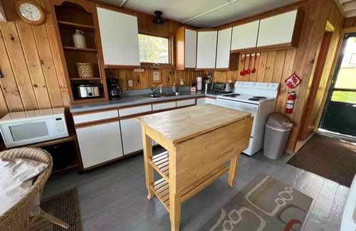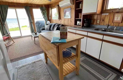 Private cozy cabin with two quiet bedrooms on the edge of the property, open kitchen/living room with all glass sliding doors overlooking beautiful Keeler's Bay. Breakfast nook or picnic table located on the deck for all your dining needs.