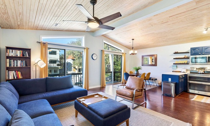 Welcome to Keep Palm! This tastefully decorated private 2BR/2BA home is perfect for a couple's retreat or family getaway. Guests access the house through the air-conditioned sunroom and enter the bright, airy open floor plan with vaulted ceilings encompassing the living room, dining room, and kitchen. For additional entertaining, the guest have access to an outdoor entertainment area underneath the house (photos coming soon). Covered and uncovered parking space available.
