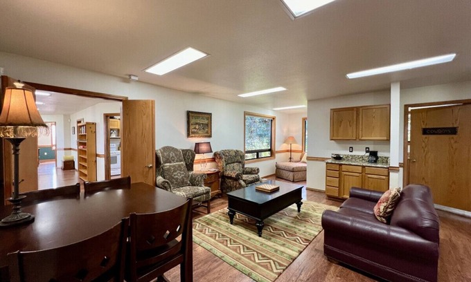 Spacious Interior: This lovely guest home boasts 5 bedrooms and 1.5 bathrooms, providing ample sleeping space for your entire group. The spacious interior is perfect for relaxing and unwinding after a day hiking in the Elkhorns or skiing at Anthony Lake.