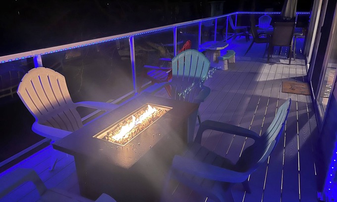 Downstairs, the lower level offers another private bedroom, full bathroom, and a second full kitchen for added convenience. The living area includes a pull-out sofa, another TV with an electric fireplace, and plenty of space to unwind. Step outside to enjoy the upper patio with a fireplace and dining area or the lower patio featuring a hot tub and high-top bar seating. With direct lake access for swimming, fishing, and boating, plus three parking spaces, with one being large enough for a trailer, this retreat is designed for comfort and convenience.